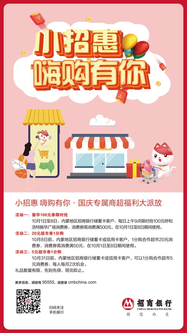 • 中秋国庆双节之际,招商银行呼和浩特分行重磅推出双节专属系列活动,回馈当地新老客户。自2018年起,招商银行呼和浩特分行持续携手本地大中小型商超开展惠民消费立减活动,旨在为本地客户提供专属便利优惠服务。特别是2020年以来招商银行呼和浩特分行陆续开展多期商超消费提振活动,为带动本地商超消费注入新的生命力。本次招商银行呼和浩特分行在国庆期间开…