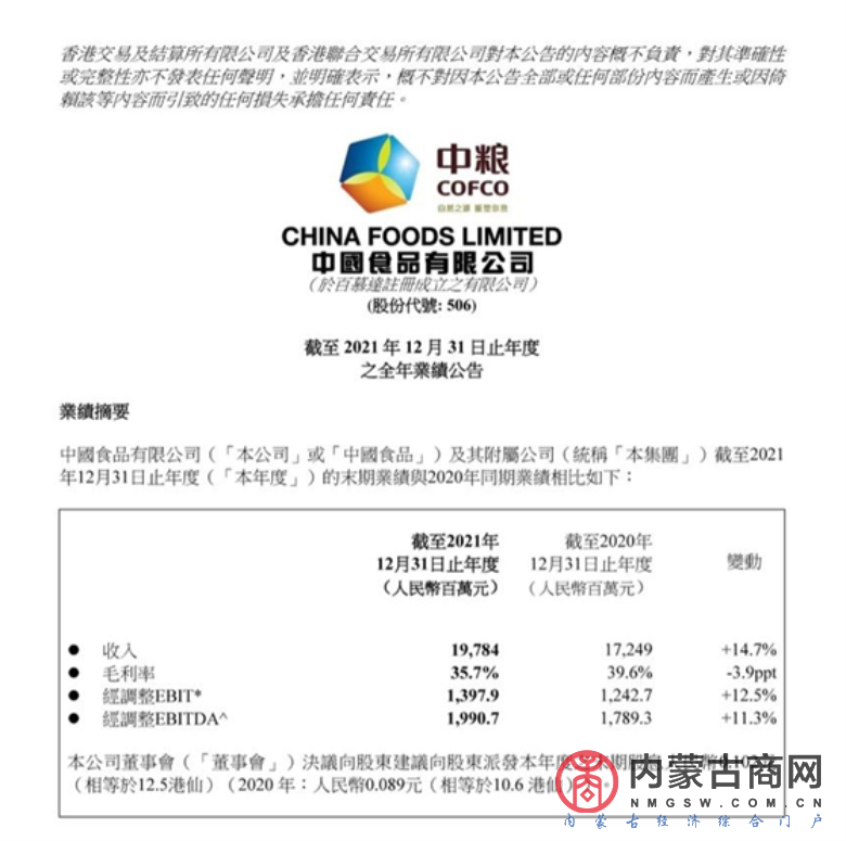 3月29日,中粮集团旗下中粮可口可乐所属的香港主板上市公司“中国食品有限公司”(下称“中国食品”或公司,股票代码:00506.HK)发布2021年全年业绩报告,营收197.84亿元(单位:人民币,下同),净利润10.75亿元,分别较上年同期增长14.7%和12.80%。